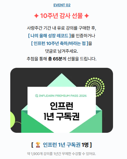 🎂 인프런이 10살이 되었어요 안녕하세요! 인프런 팀입니다.연말 잘 보내고 계신가요? 2025년의 인프런은 어느 해보다 특별합니다.여러분 덕분에 인프런이 드디어 10주년을 맞았거든요! 10년 동