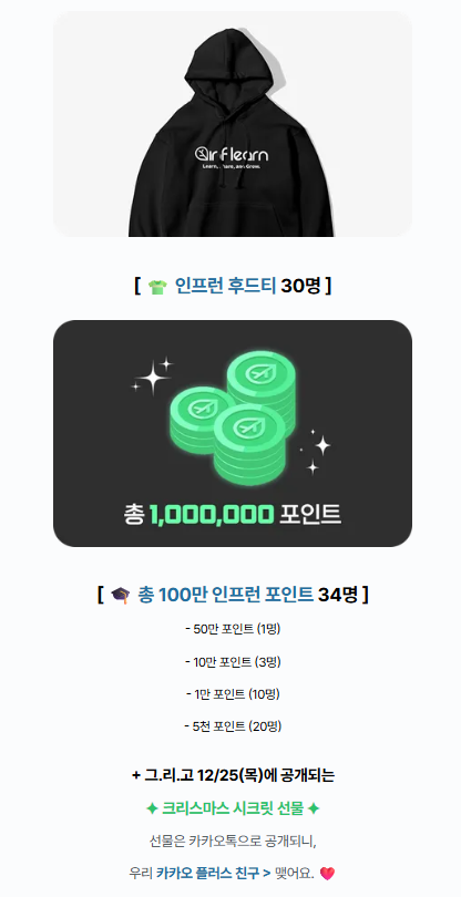 2. 10주년 감사 선물(1년 구독권, 후드티, 총 100만 인프런 포인트)