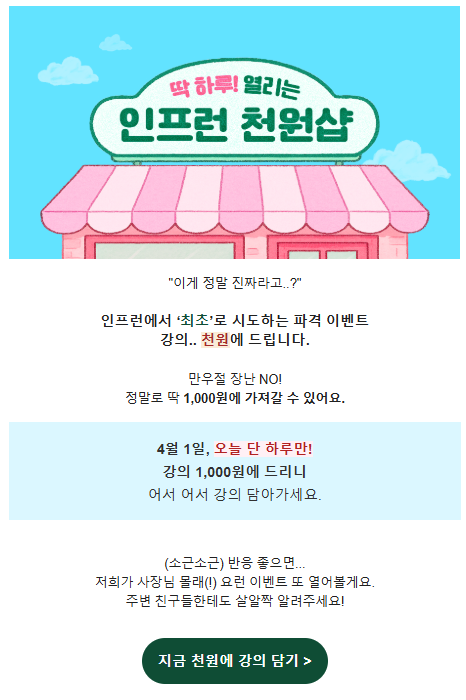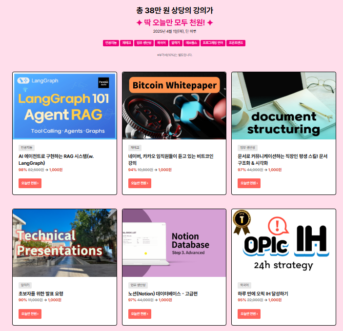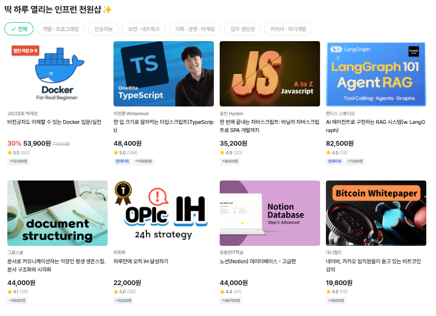 | [인프런] 다시 돌아온 30% 할인!! (4/21~4/28) (0) | 2025.04.22 |